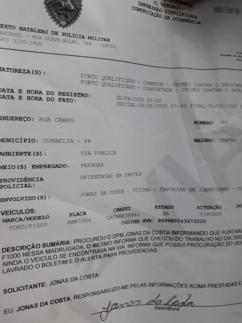 Caminhonete F-1000 é furtada durante a madrugada em Corbélia
